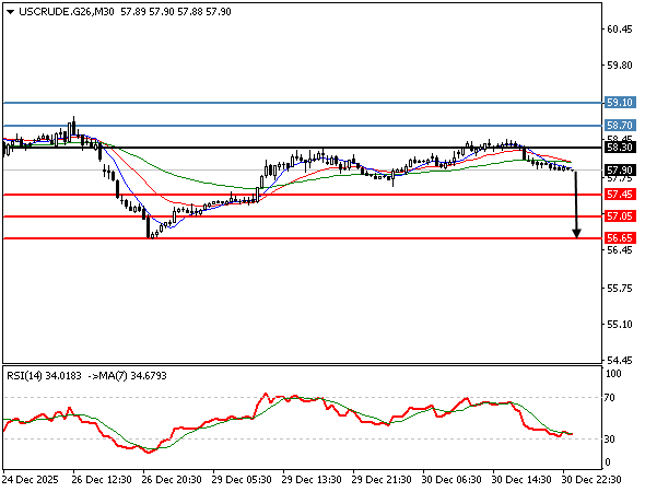| النفط الأمريكي الخام | 30-12-2025 22:40:00 GMT | المدى القصير | مرجح النزول ![]() | 57.90 | 57.45 | 58.30 |
