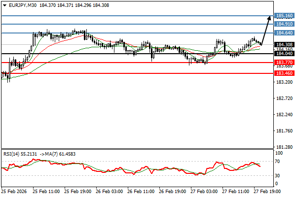 | يورو/ين | 27-02-2026 18:37:00 GMT | المدى القصير | مرجح الصعود ![]() | 184.30 | 184.04 | 184.64 |