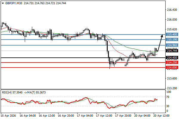 | أسترليني/ين | 20-04-2026 08:15:00 GMT | المدى القصير | مرجح الصعود ![]() | 214.50 | 214.49 | 215.14 |