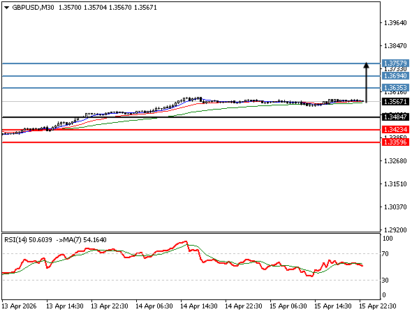 | GBPUSD | 15-04-2026 04:12:00 GMT | Short Term | Upside favored ![]() | 1.3565 | 1.3484 | 1.3635 |