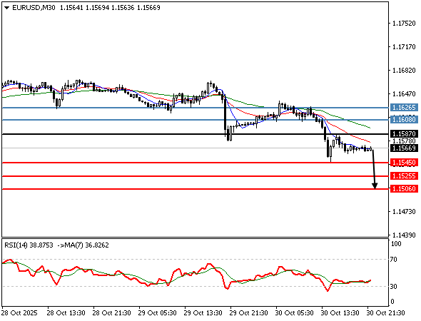 | یورو به دلار | 30-10-2025 22:20:00 GMT | کوتاه مدت | گرایش به نزول  | 1.1566 | 1.1545 | 1.1587 |