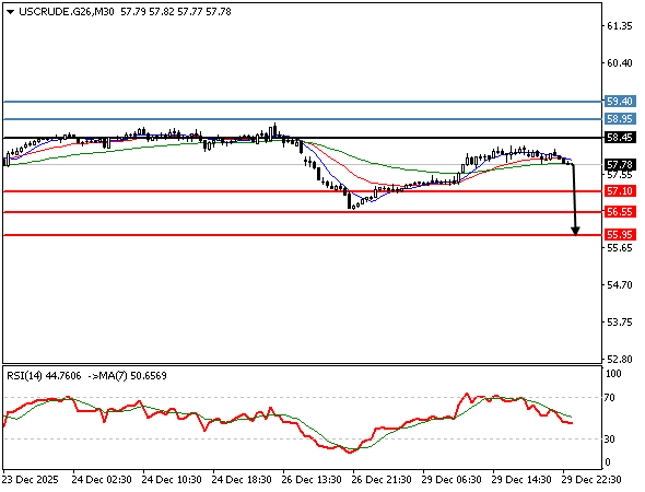| نفت خام | 29-12-2025 22:40:00 GMT | کوتاه مدت | گرایش به نزول ![]() | 57.78 | 57.10 | 58.45 |