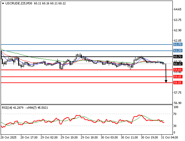 | نفت خام | 30-10-2025 22:35:00 GMT | کوتاه مدت | گرایش به نزول  | 60.27 | 59.60 | 60.90 |