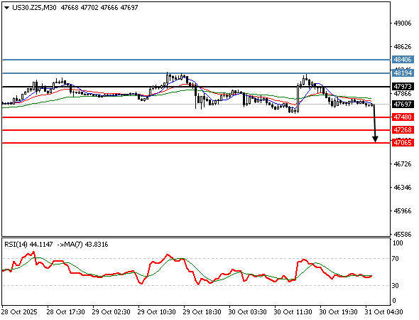 | شاخص داو جونز | 30-10-2025 09:20:00 GMT | کوتاه مدت | گرایش به نزول  | 47665 | 47630 | 48000 |