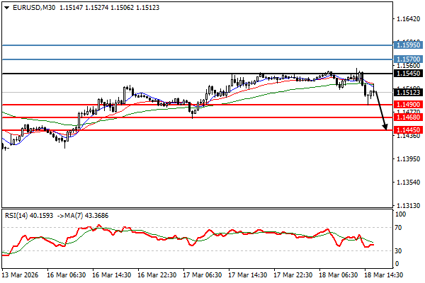 | 欧美 | 18-03-2026 14:16:00 GMT | 短线 | 看跌 ![]() | 1.1512 | 1.1490 | 1.1545 |